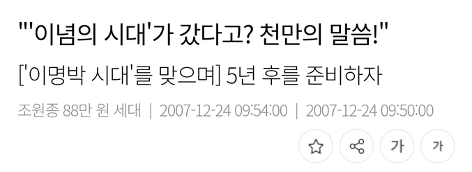 이에 대해 좌파 논객 조원종씨는 이명박 후보의 당선이 확정된 뒤, '이념의 시대는 갔다고? 천만의 말씀'이라는 제목의 글을 프레시안에 기고했다. 이념전쟁은 결코 끝나지 않는다는 경고였다.