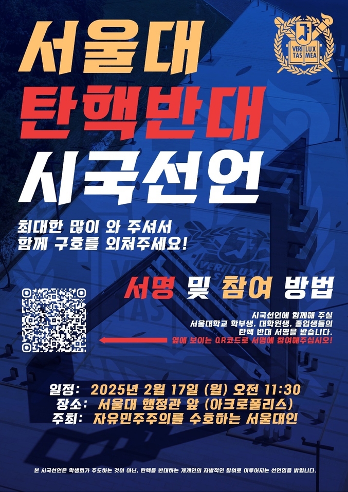 현재 연세대를 시작으로 전국 대학교들이 연대해서 탄핵반대 시국선언을 진행 중입니다. 서울대가 가진 상징성을 생각할 때 서울대에 많은 분들이 참여해주신다면 다른 대학들의 시국선언도 전부 큰 힘을 받을 것이라 생각합니다.