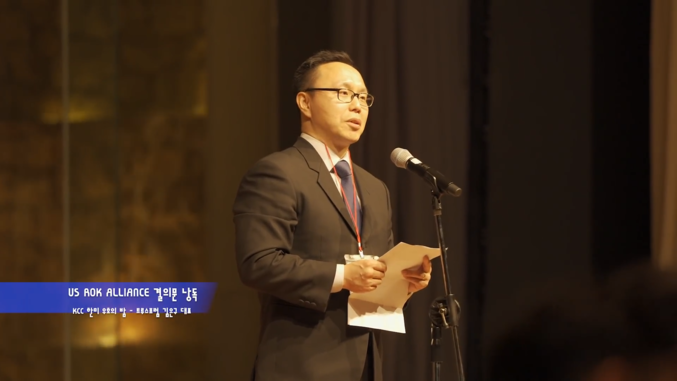 So, here today, we, conservatives in the Republic of Korea, stand for a strong US-ROK alliance. The majority South Koreans are supporting a strong US-ROK alliance and we condemn all attempts to break it down. We declare that all people held as slaves within North Korea shall be free. We condemn all activities supporting the brutal regime of North Korea. We call for every people and every nation that defend freedom and truth to unite to achieve this mission. We invoke the gracious favor of Almighty God to accomplish this through the US-ROK alliance.