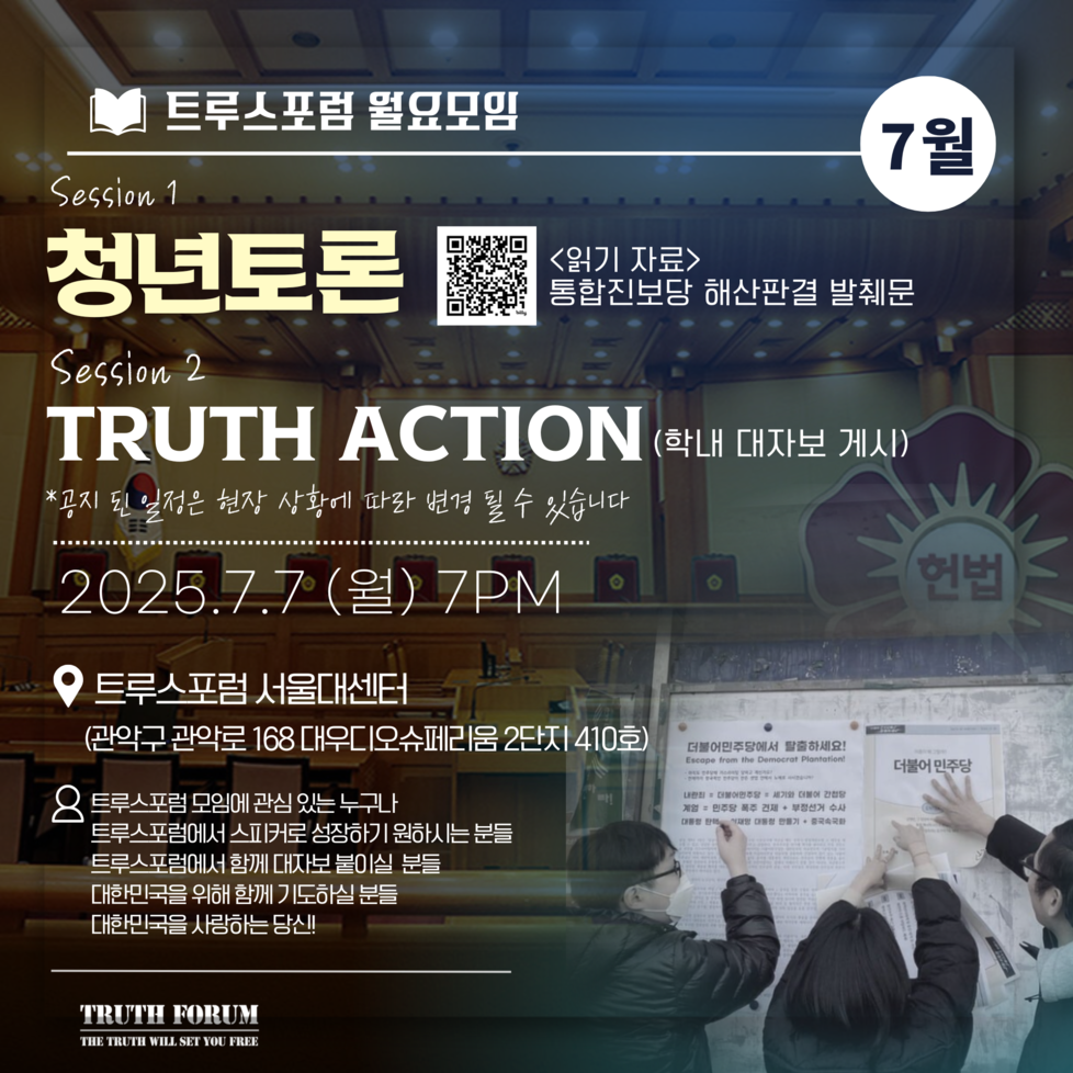 7월 7일(월), 트루스포럼 월요모임은 청년토론과 Truth Action으로 진행됩니다!