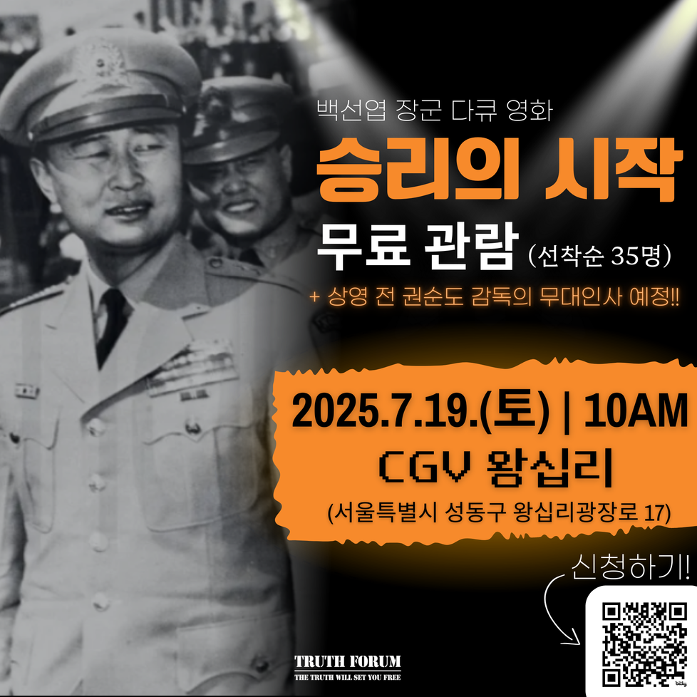 백선엽 장군의 삶과 대한민국의 역사를 조명한 영화 《승리의 시작》이 오는 7월 19일(토) 오전 10시, CGV 왕십리에서 상영됩니다.
