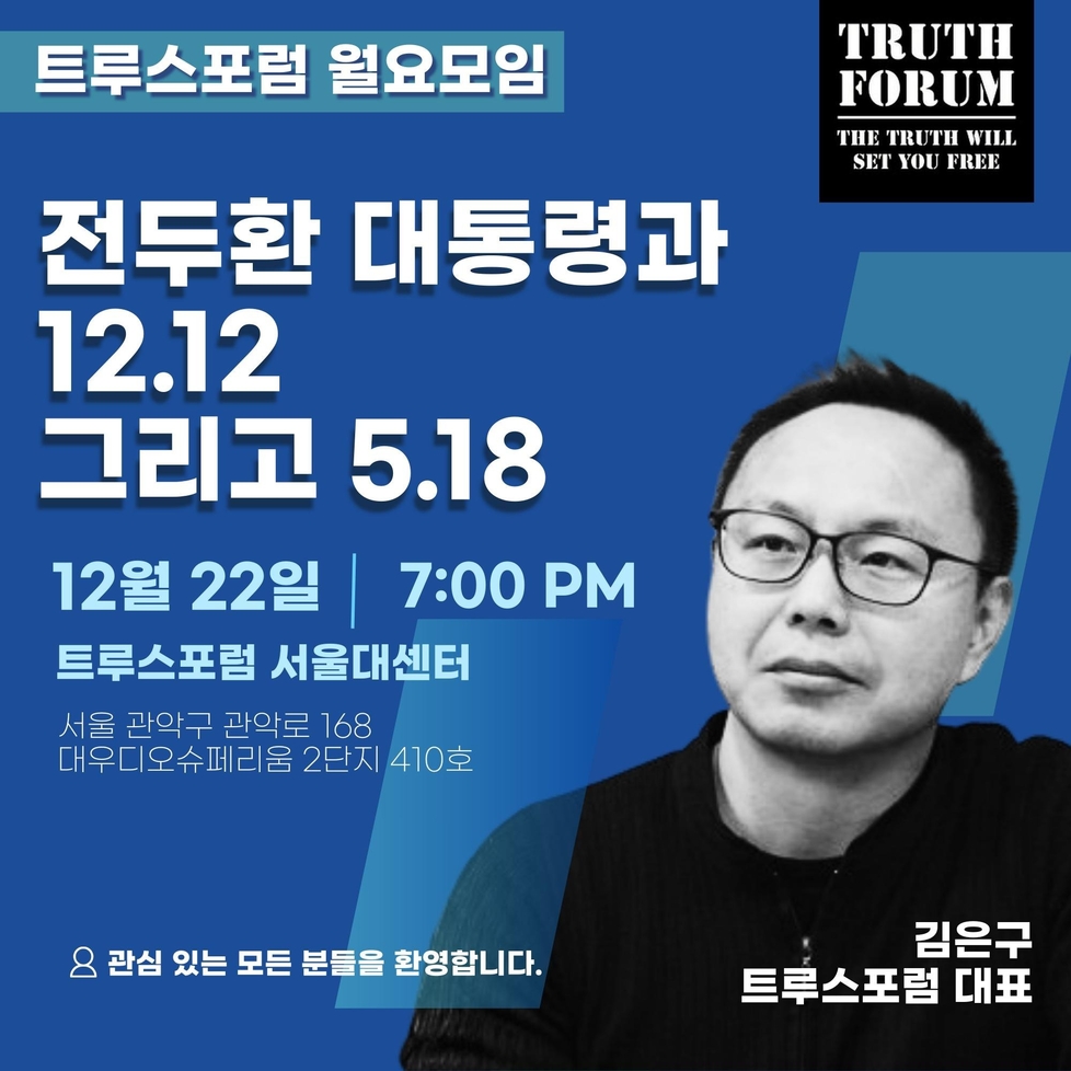 돌아오는 주 월요일(12월 22일) 저녁에는 <전두환 대통령과 12.12 그리고 5.18>을 주제로