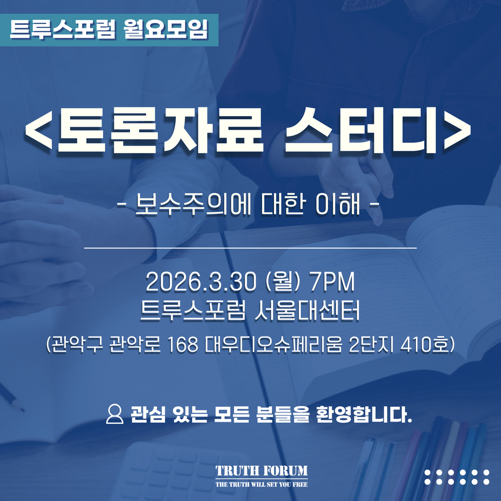 3월 30일(월) 트루스포럼 월요모임은 〈토론 자료 스터디〉로 진행됩니다.