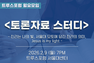 [트루스포럼 월요모임 안내] 다가오는 2월 9일(월) 트루스포럼 월요모임에서는 토론자료 스터디 모임을 진행합니다. 이번 스터디에서는 「진리는 나의 빛 – 서울대 모토에 담긴 진리의 의미 (Jesus is my light)」 라는 글을 함께 읽고, 각자가 느낀 점과 생각, 질문들을 자유롭게 나누고 서로의 의견을 듣는 시간을 가지려고 합니다. 특별한 준비 없이도 주제에 관심 있는 분이라면 누구나 편하게 참여하실 수 있습니다. 일시: 2026년 2월 9일(월) 내용: 토론자료 스터디 및 자유 토론 함께 읽고, 함께 생각하며, 서로의 나눔을 통해 더 깊어지는 시간이 되길 기대합니다. 트루스포럼 사무국 <토론 자료> <오시는 길>